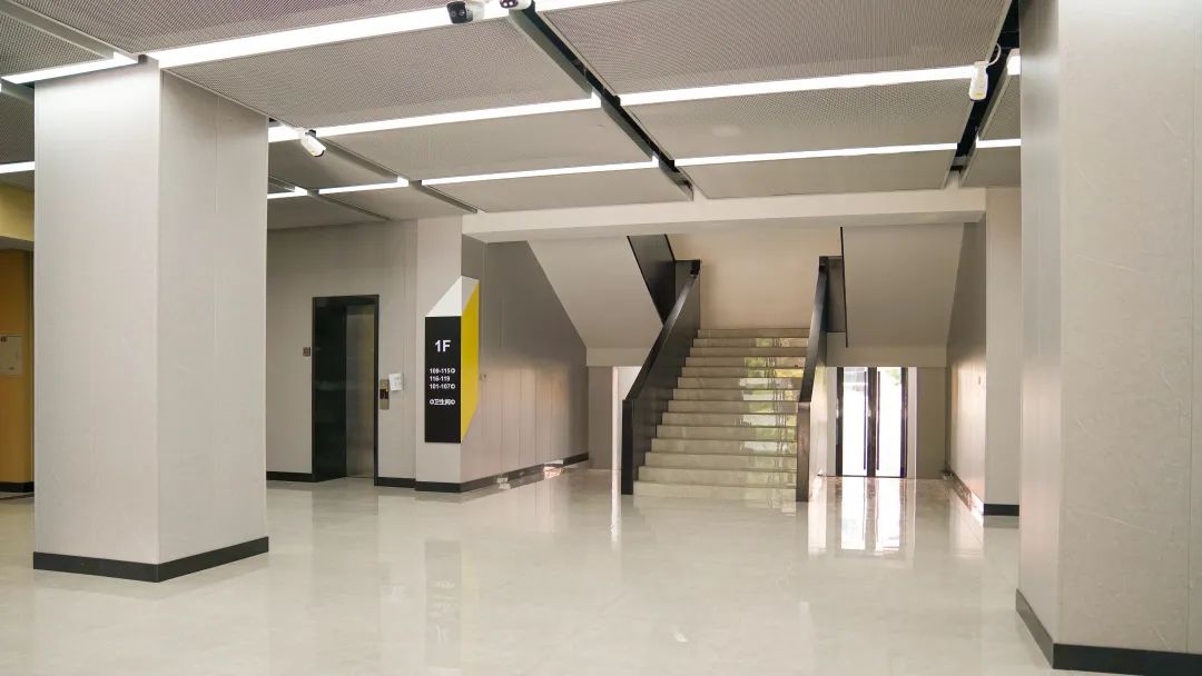 步入本次改造后的一号楼,焕然一新的原木色墙壁和规整的布局让人眼前一亮。装修风格现代简约,宽敞明亮的大厅中央是黑色木质感楼梯,两侧新增置了电梯,有效解决了高层上下楼费时和密集时段上课拥堵的难题。