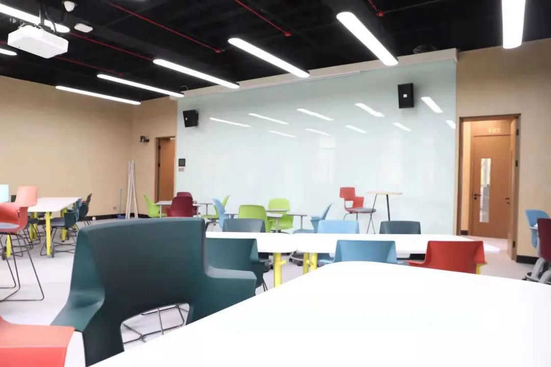 创意思维教室是我校设计思维学院的专业教室。为充分激发学生的创意思维,教室的设计风格充满活力,既可在教师授课时形成剧场式的环形空间,又为分组创作提供了多种选择。此外,教室设置在一层最靠东面的位置,课程中的热身活动、头脑风暴都可以在室外进行。