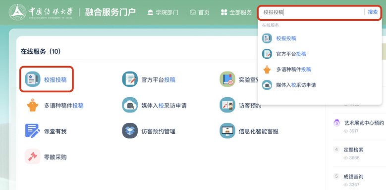 投稿方式:方式一:登录世界杯直播在线观看融合服务门户(https://i.cuc.edu.cn/),搜索“校报投稿”,填写表单并提交。