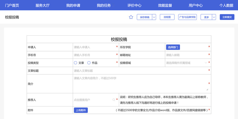 方式二:登录中传APP,点击“i中传”版块的“更多”,在“媒体服务”中点击“校报投稿”,填写表单并提交。