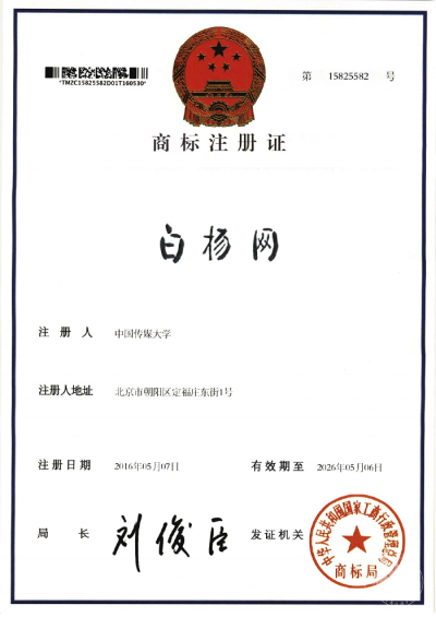 白杨网在2015年教育部首届“全国高校名站名栏” 评选活动中,获评全国高校优秀网站(全国共评选20家),白杨网首页“今日推荐”栏目获评全国高校优秀栏目(全国共评选30个),初步实现了建设“名站”“名栏”的目标。2016年6月,从国家工商行政管理总局商标局传来喜讯,“白杨网”在9大类商品和服务项目上注册成功并取得商标注册证书,在这些商品和服务项目获得法律保护,这9大类分别是第9、16、36、37、38、39、40、42、45类。