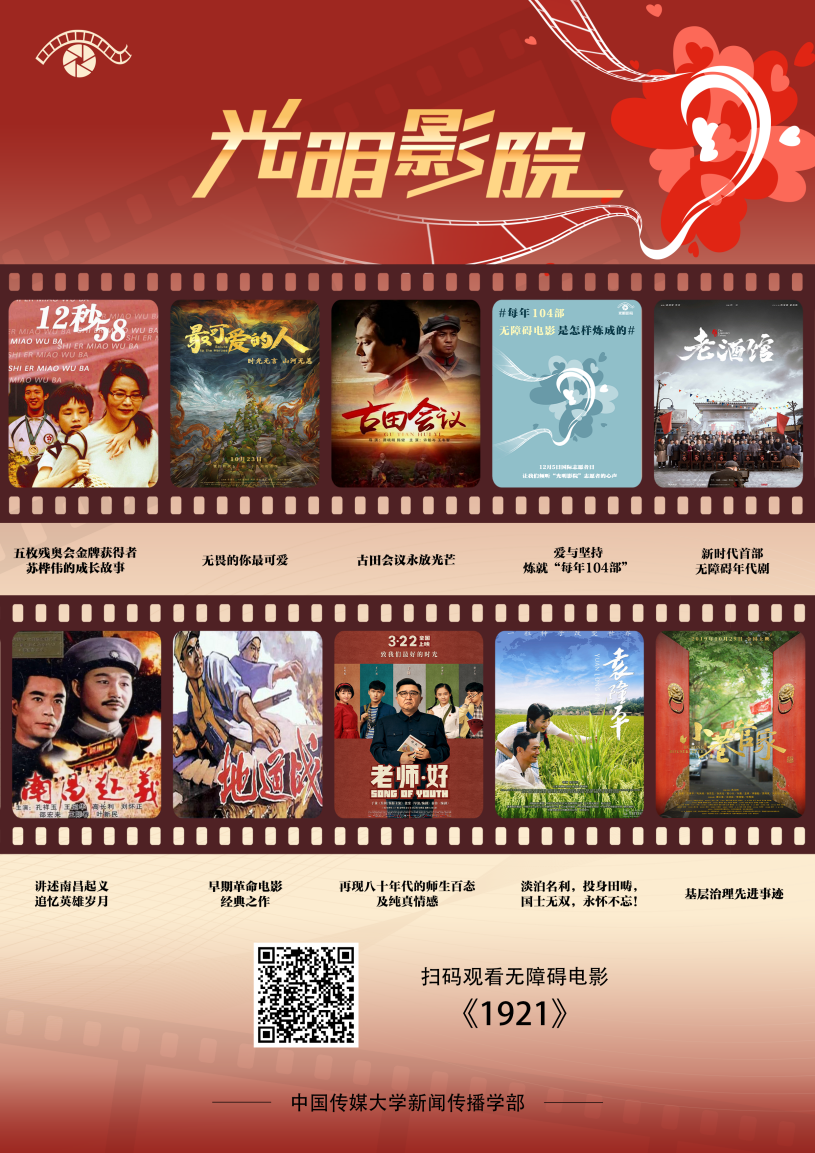 世界杯直播在线观看发挥视听创作专业优势,深耕无障碍信息传播研究与实践,发起“光明影院”公益项目,500多名师生志愿者参与其中,在电影对白和音响的间隙,插入对于画面的声音讲述,制成可复制、可传播的无障碍电影,为视障人士制作、传播无障碍电影,构筑了一条“文化盲道”。