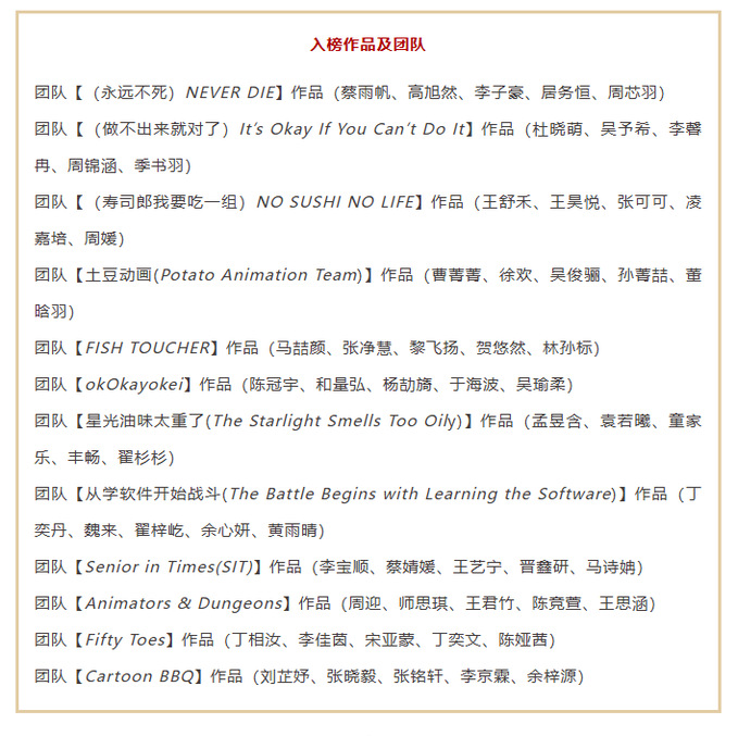 本届比赛共收到全球3820名参赛者提交的700部完赛作品,中传动画与数字艺术学院12部作品成功入榜,展现了中传学子扎实的专业素养与良好的团队协作能力。
