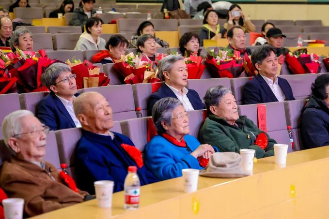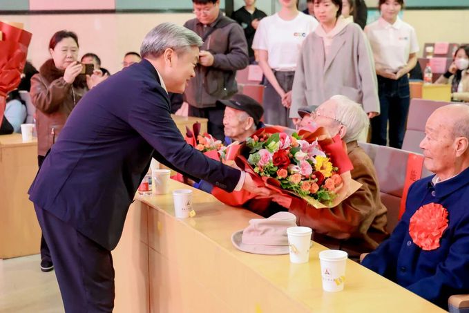 廖祥忠为90岁及以上的寿星代表献花,并致以问候。学校领导班子成员、党委常委、校务委员会主任为年满80岁、70岁寿星代表送上鲜花,表达祝福。