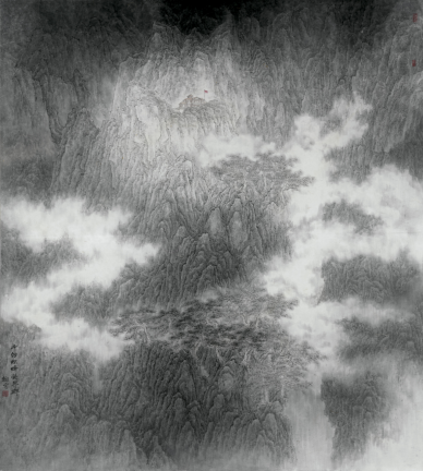 作者阐释:作品《千仞炽烽铸界碑》以“斧劈皴”技法描绘山骨的刚硬,以“泼墨法”渲染山涧的混沌,意在呈现自然环境的严酷冷峻,表达对坚守边关将士的无上礼赞以及对家国意志如山不可移的讴歌。