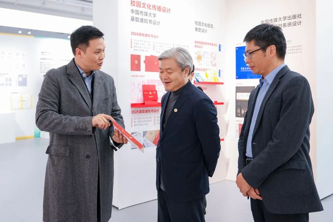 展览现场,校领导驻足各展区,认真聆听作品的创作背景、技术应用情况及实践意义。策展人武定宇详细介绍了学院在 “人工智能赋能传播设计” 方向的课程建设与人才培养模式,学院正积极推动从 “设计的传播” 向 “传播的设计” 转型,全力构建具有中传特色的交叉学科体系。