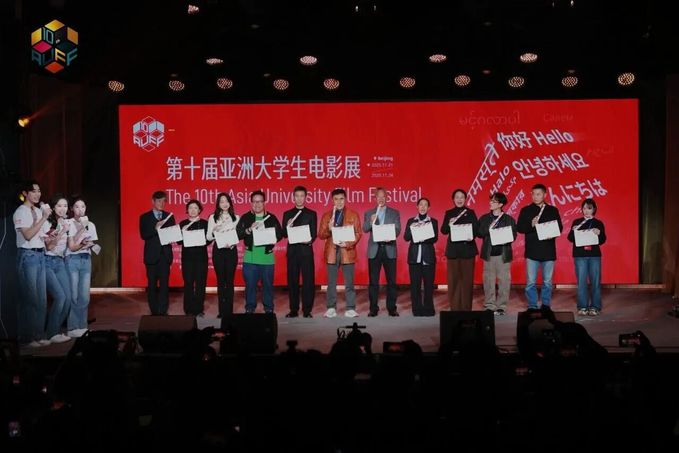 在开幕式的尾声,嘉宾代表们受邀上台,与评委会成员共同开启了第十届亚洲大学生电影展的“一场一镜一次”。