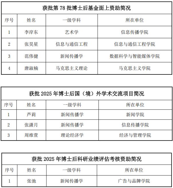 (通讯员 张蔚)近日,中国博士后科学基金会连续公布了第78批面上资助、2025年度博士后国(境)外学术交流项目、2025年度博士后科研业绩评估考核的资助结果。我校有4名博士后获得第78批博士后基金面上资助,3名博士后获得博士后国(境)外学术交流项目资助,1名博士后获得博士后科研业绩评估考核三档资助。资助情况如下: