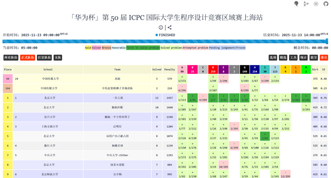 11月23日,ICPC亚洲区域赛(上海)在上海大学收官,来自北京大学、中山大学、上海交通大学、北京理工大学、世界杯直播在线观看等198所高校的319支队伍展开较量。我校信息与通信工程学院2023级通信工程专业陈旻庚、新闻学院2023级传播学专业(计算传播方向)朱霁、动画与数字艺术学院2023级数字媒体技术专业(游戏设计方向)叶阳组成的“再演”代表队开局便展现出强劲实力,始终以稳定状态向金牌区推进,最终位列第44名,斩获银牌;另一支由信息与通信工程学院2024级物联网专业李润淇、信息与通信工程学院2024级通信工程专业刘同星、计算机与网络空间安全学院2024级计算机科学与技术专业马一天组成的“中传赶紧修椰子井地道队”代表队凭借开局快速解出两题的优势,在上海赛站题目难度较高的情况下稳住排名,拿下铜牌。